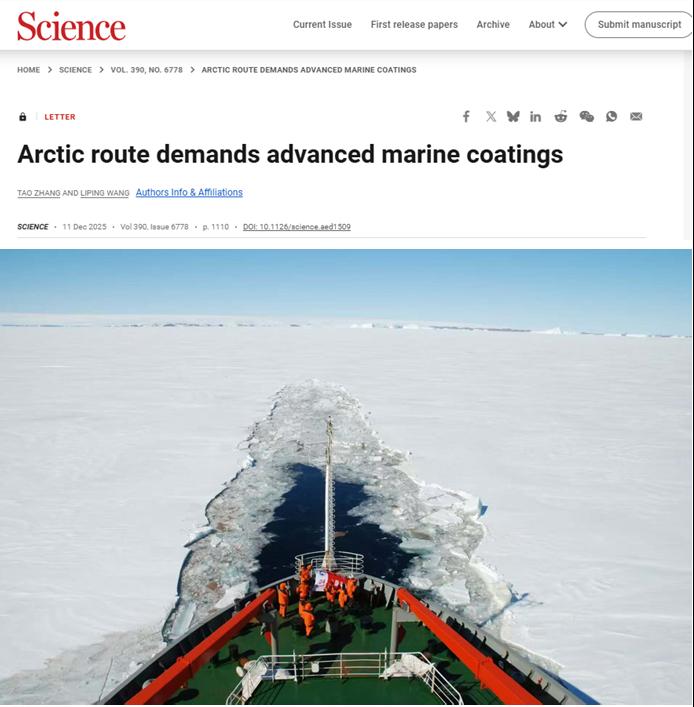 Researcher Zhang Tao and Researcher Wang Liping's team published a Letter titled “Arctic route demands advanced marine coatings” in the internationally renowned academic journal Science. The study systematically analyzed the challenges and development directions facing marine coatings under dual pressures of extreme environments and ecological conservation following the opening of the China-Europe Arctic Express route, providing a crucial technical pathway for the safe and sustainable operation of Arctic shipping routes.